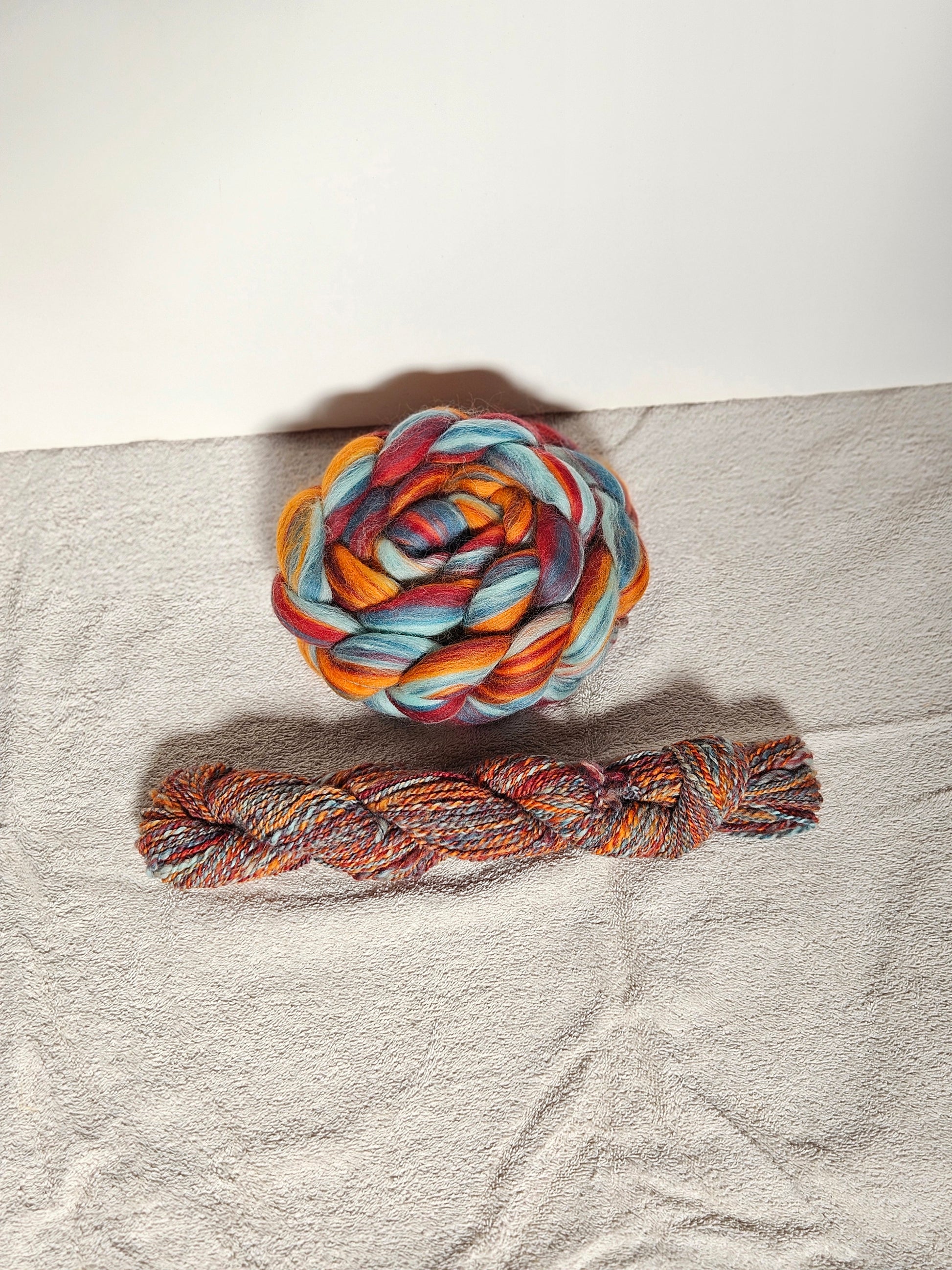 Gorgeous Merino Wool Combed Top blended into striking colors. Soft handle that spins up beautifully. Sample yarn was spun from the fold. 4 oz braid